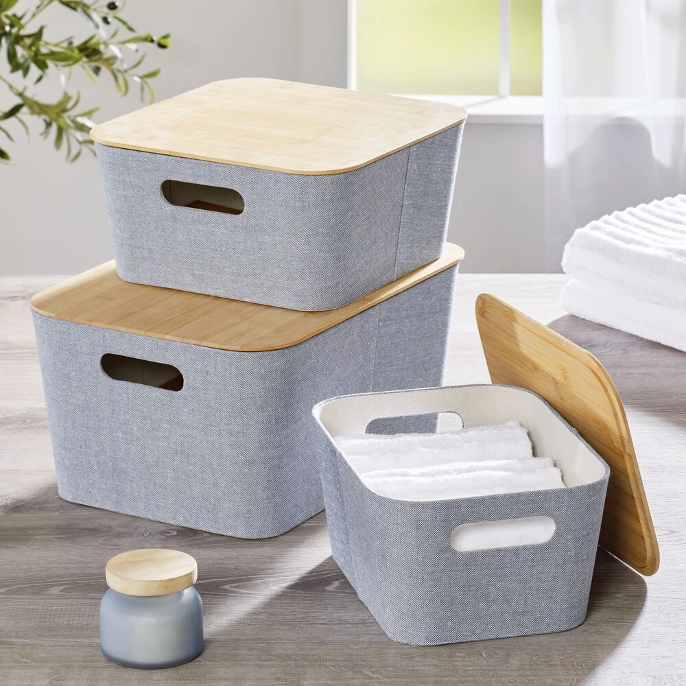 A modern take on home organizing, our stackable fabric bins make the perfect catchall for essentials around the office or home. The durable bamboo lid brings a natural look to home organizing while keeping contents protected. Bins are versatile, lightweight, and easy to transport. Use side by side or stacked vertically for custom storage.
